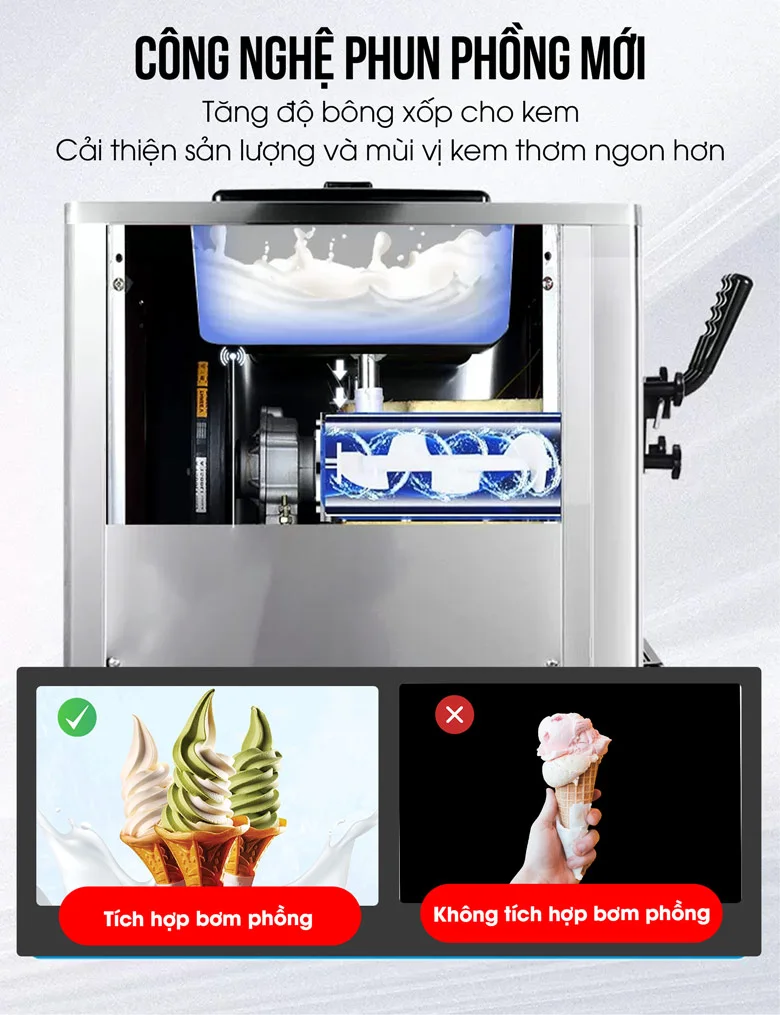 Công nghệ phun phồng mới của Máy làm kem tươi cao cấp Royal 838 Promax (2 block làm lạnh) được nâng cấp giúp kem bông hơn, ngậy hơn và hấp dẫn hơn. Chức năng này còn tăng sản lượng kem, tiết kiệm chi phí nguyên liệu cho chủ quán.