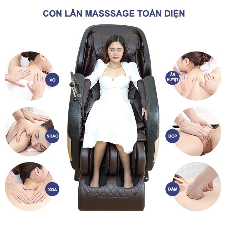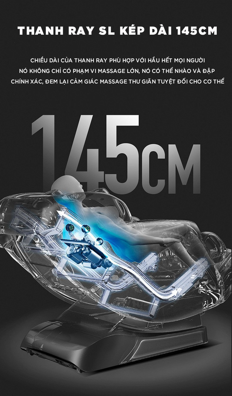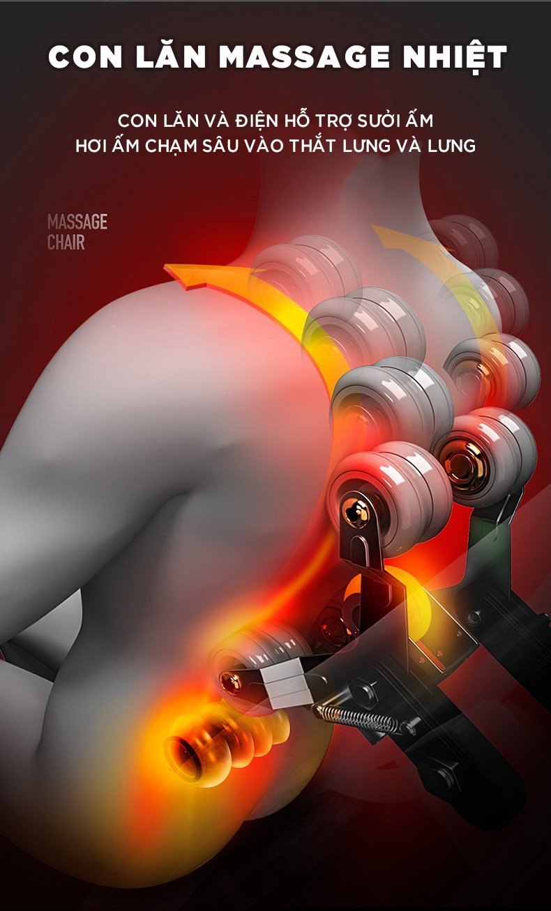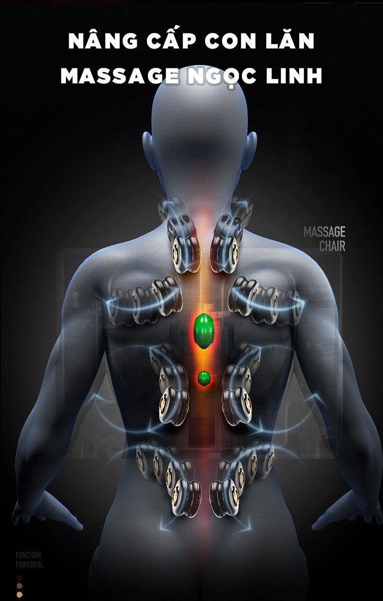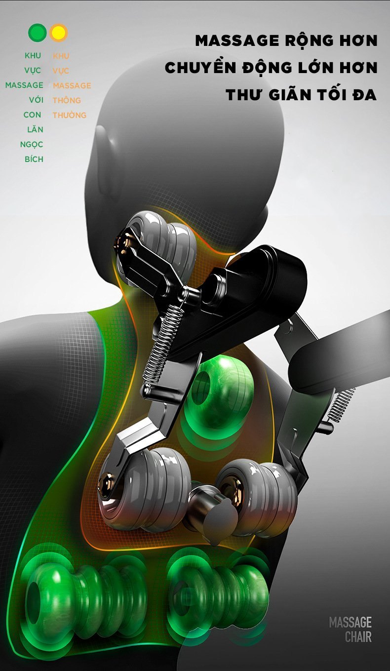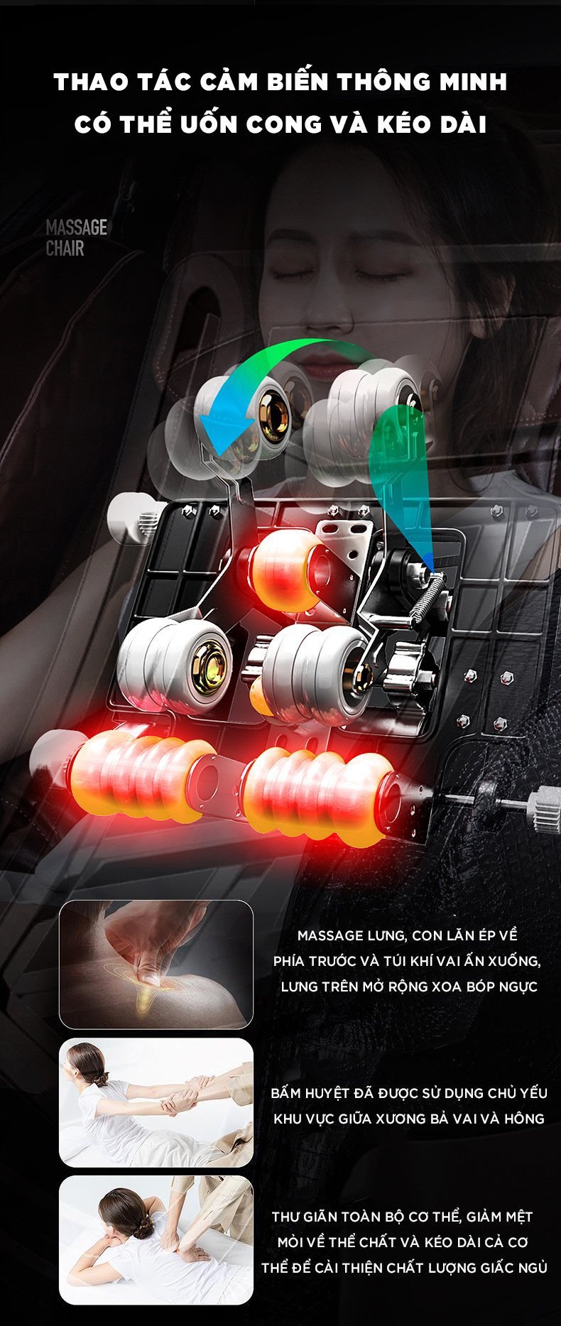 Hệ thống con lăn massage thông minh được thiết kế thông minh với đường đi SL ôm sát theo đường cong cơ thể cho phép massage, xoa bóp từ cổ tới mông có tác dụng làm giảm độ cứng cơ và các hiện tượng đau vai gáy, xương khớp bằng phương pháp massage như nhào, ấn, vỗ, miết, shiatsu…