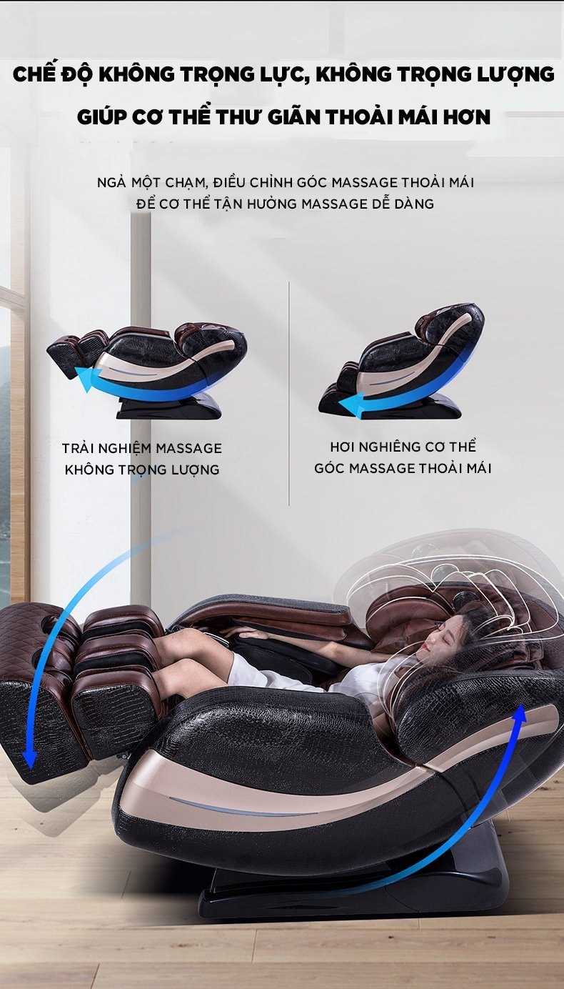 Chương trình massage không trọng lực sẽ đưa người nằm vào vị trí mà góc giữa phần đùi và phần bắp chân là 135 độ. Tư thế không trọng lực mô phỏng theo tư thế của các phi hành gia vũ trụ NASA. Ở tư thế này sẽ hạn chế tối đa trọng lực tác động vào cơ thể, giúp máu lưu thông từ các bộ phận về tim tốt hơn từ đó giúp bạn sảng khoái, tỉnh táo và thư giãn một cách tối đa.