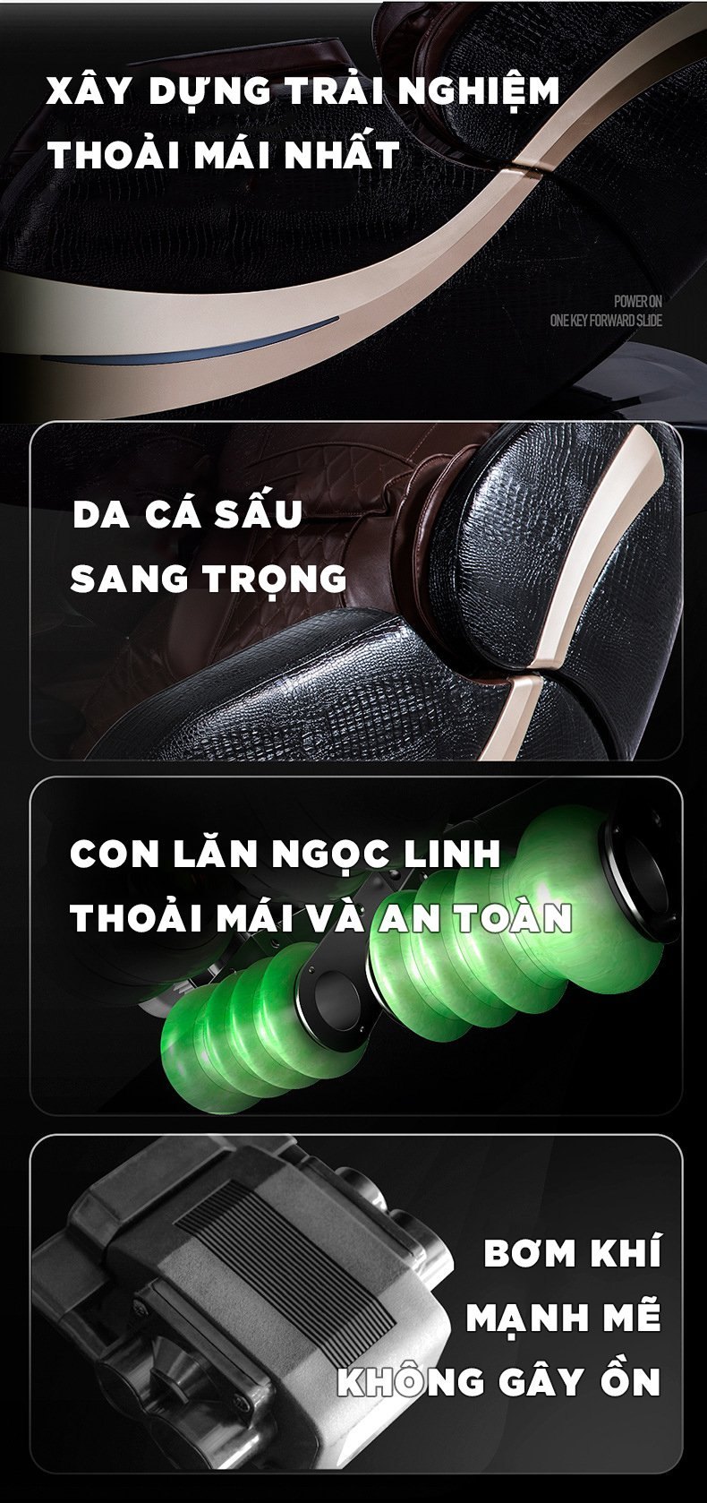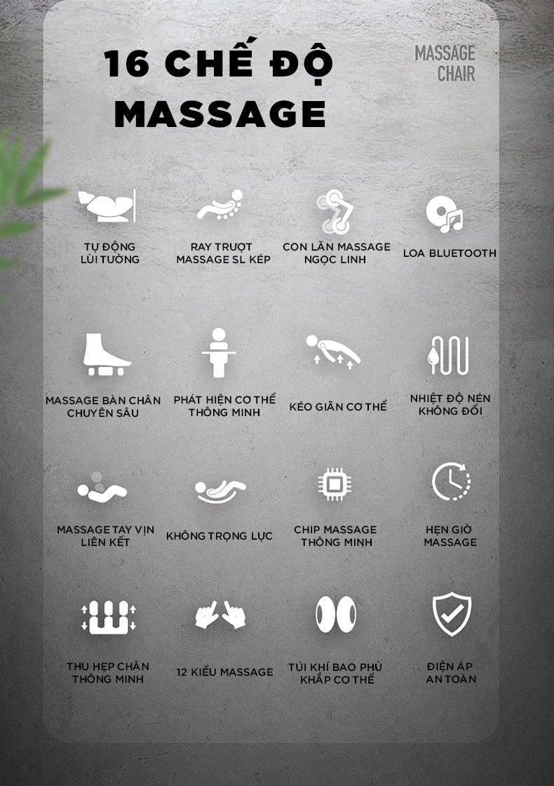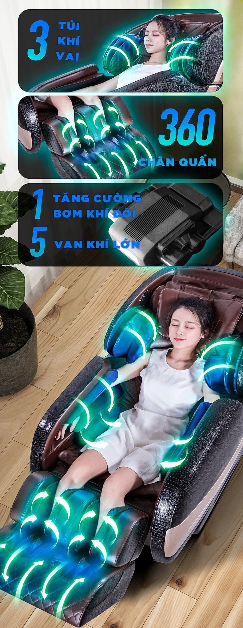 Nổi bật với việc thiết kế túi khí massage thông minh trang bị ở những vùng tay, vai, chân, hông… có khả năng massage liên tục với các động tác co bóp nhịp nhàng nhờ được ứng dụng những phương pháp massage hiện đại nhất, sẽ mang tới cảm giác thư giãn các cơ cùng xương khớp, giúp khách hàng có luôn cảm thấy thư thái, thoải mái và tự tin nhất.