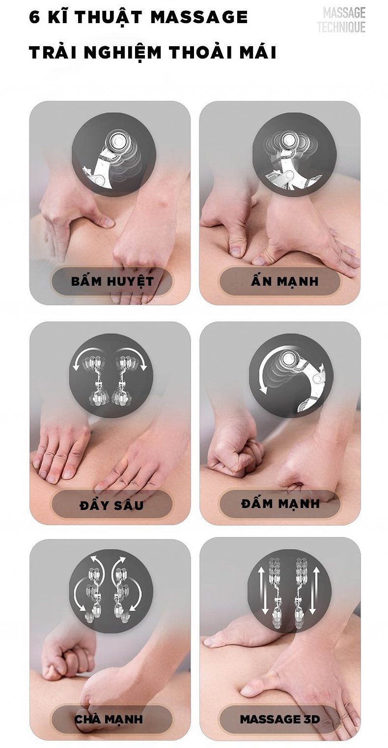 Với 6 kĩ thuật massage: bấm huyệt, ấn mạnh, đẩy sâu, đấm mạnh, chà mạnh và massage 3D khả năng ấn nhả linh hoạt, thực hiện được động tác nhấn mạnh giúp bạn cảm thấy như được massage từ tay một nhân viên trị liệu chuyên nghiệp. Con lăn còn tùy chỉnh được độ mạnh – yếu theo nhiều cấp độ, phù hợp với nhiều cấp độ thư giãn khác nhau ngay tại nhà.