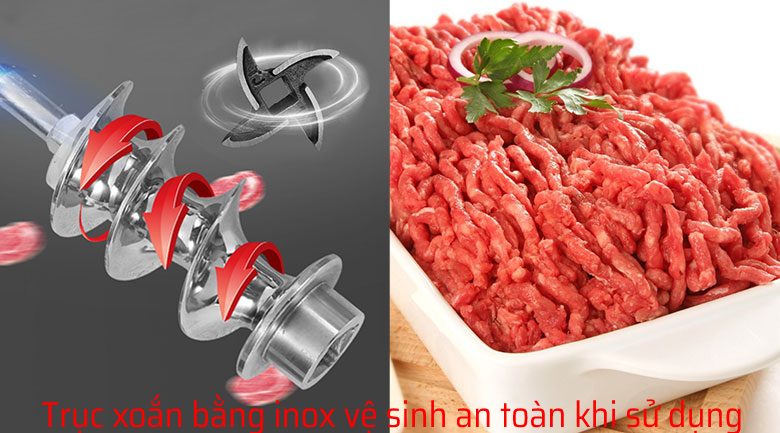 Lưỡi dao thép không gỉ sắc bén kết hợp với trục xoắn mạnh mẽ, chắc chắn, thịt được xay nhuyễn đều chỉ trong thời gian vài giây.